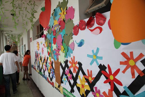 走廊里:孩子们的剪贴画贴满了墙壁 |